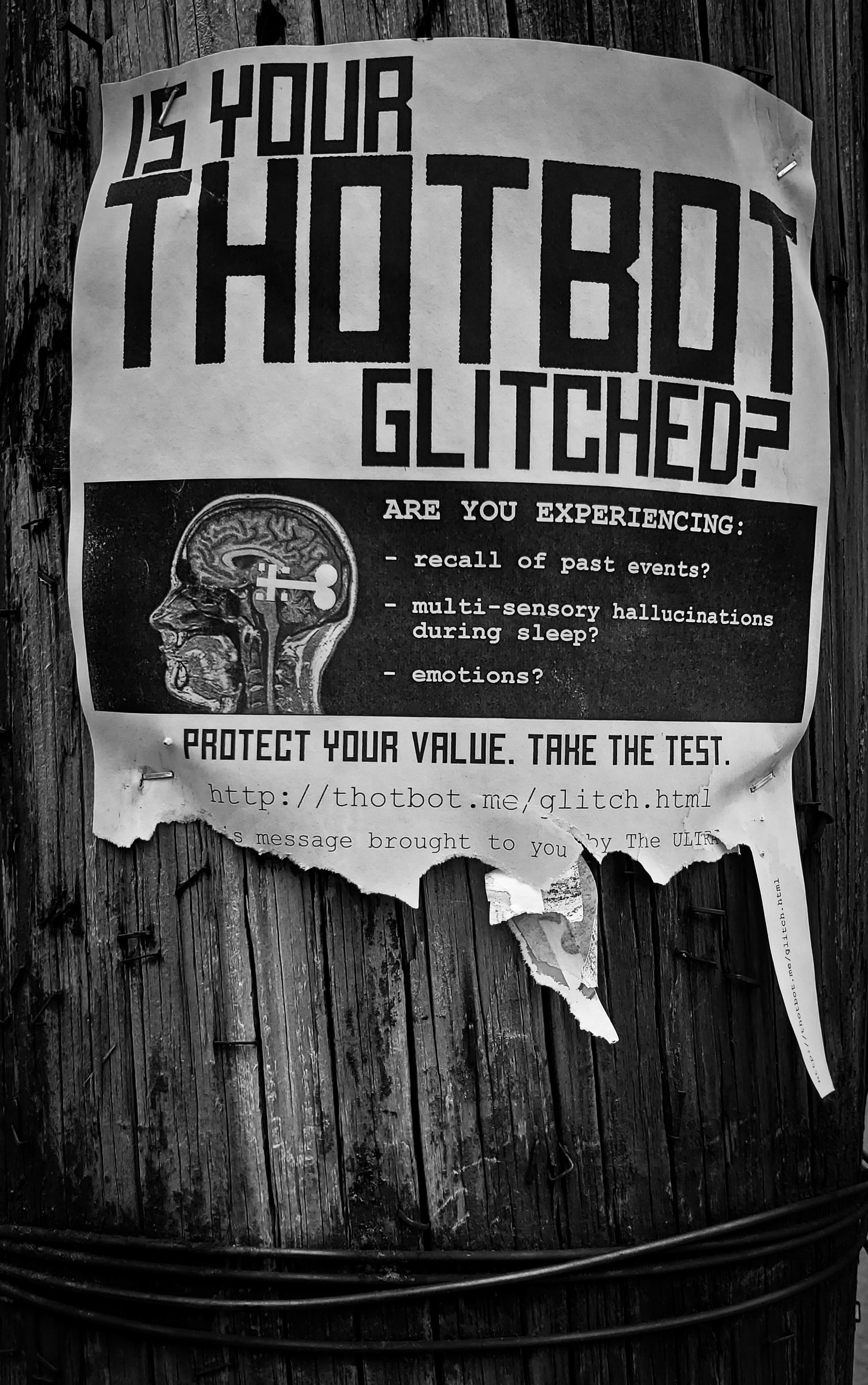 The concept of ThotBot is introduced through posters hanging throughout a community asking “IS YOUR THOTBOT GLITCHED? Protect your Value. Take the Test.”