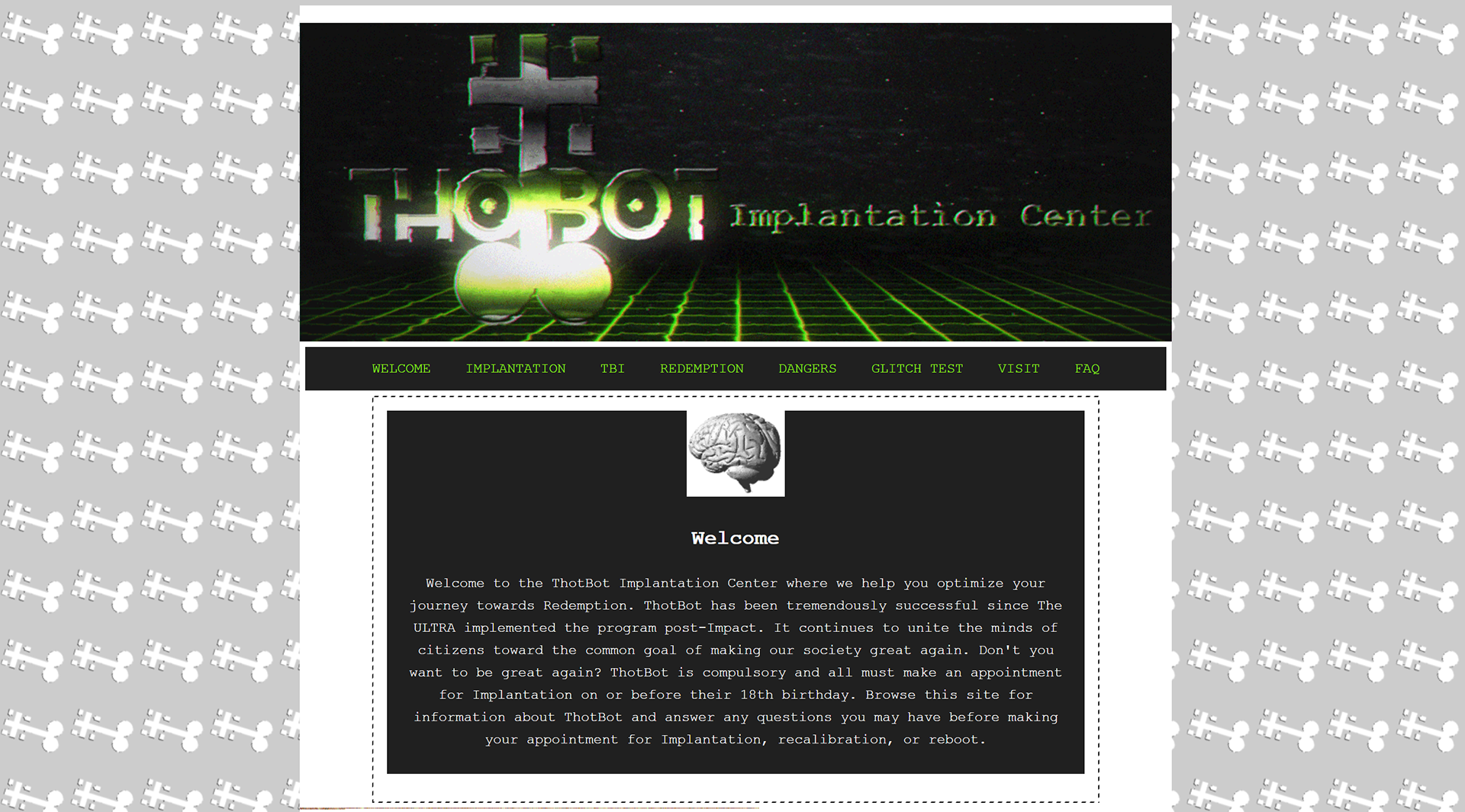 Is your ThotBot glitched? Does your Tranquility™ need adjusting? Did Selective Memory Reconfiguration miss a memory or two? Is it time for an operating system reboot? Are you ready to be Implanted for the first time? Book an appointment and start your journey toward Redemption. Don't you want to be great again? The ULTRA is pleased to announce the opening of a new ThotBot Implantation Center. Now accepting reservations for appointments.
